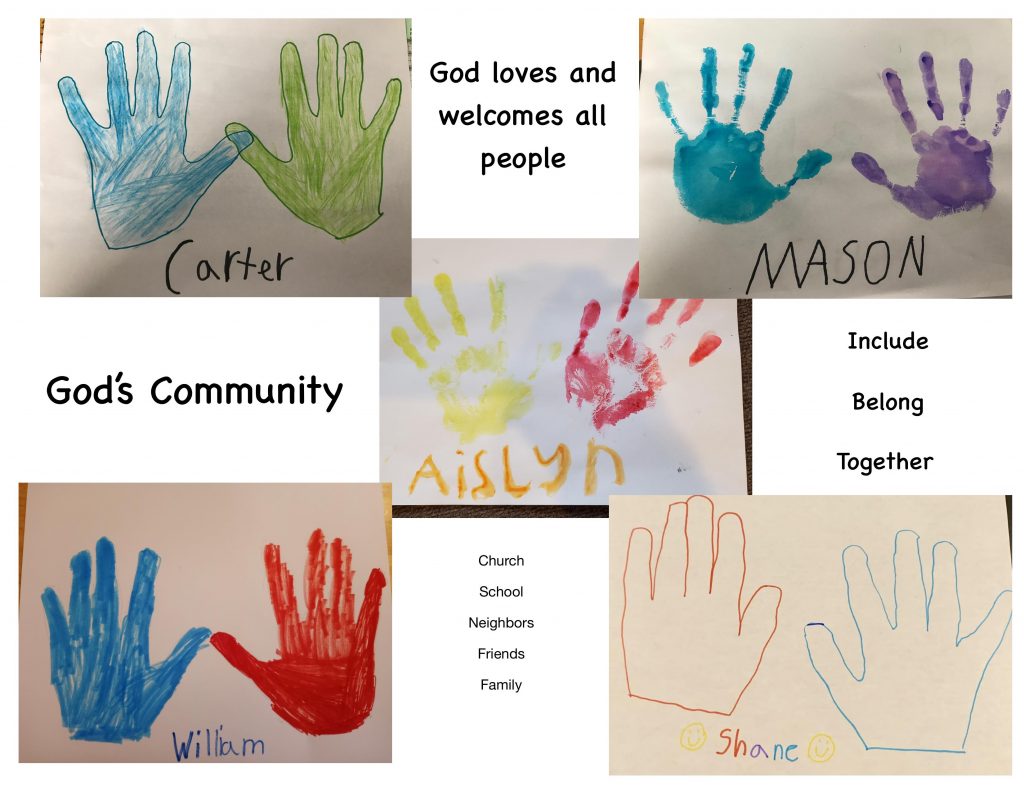 The picture you see included with these thoughts is a composite of the hands of children participating in our Sunday School Zoom class and the words they used to describe God’s community.